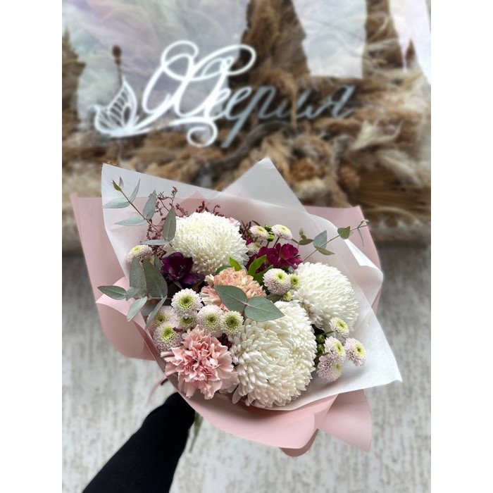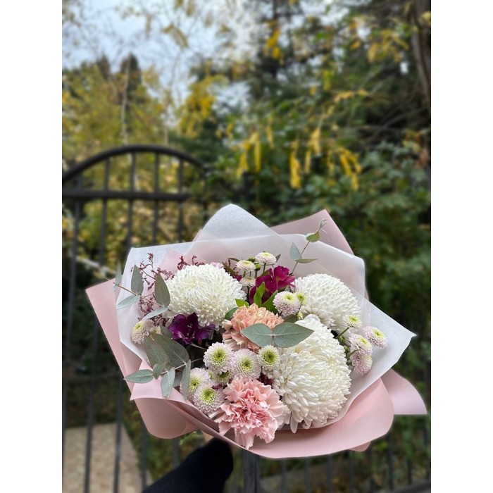 Смешанный букет, выполненный в нежных оттенках. В составе: хризантема, гвоздика, альстромерия.