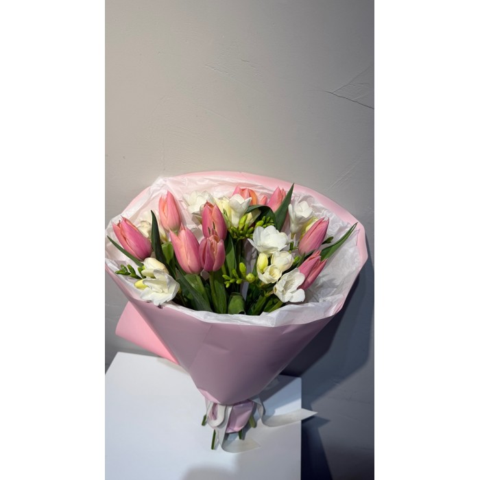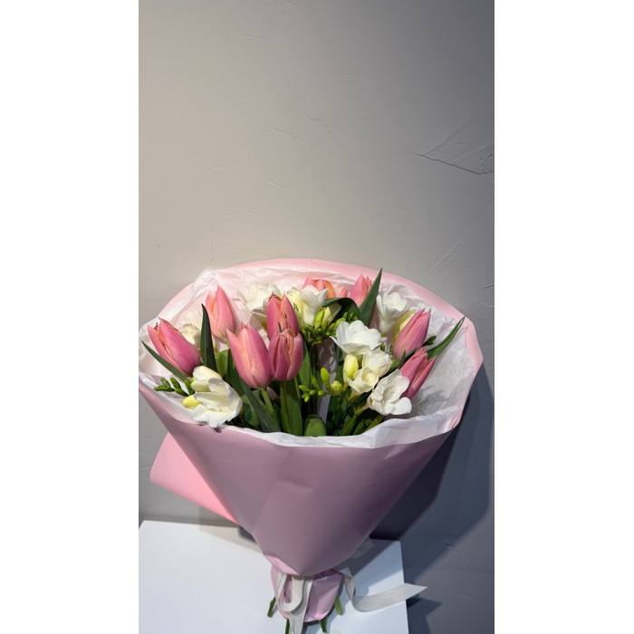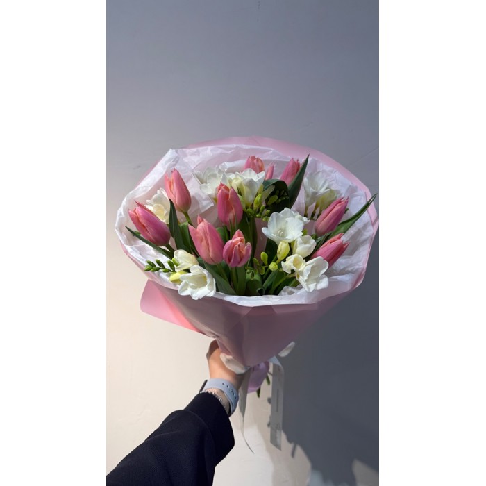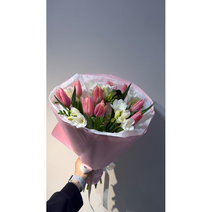 Весенний букет из классического сочетания: тюльпаны и фрезия. Упакован букет в нежную пленку.
