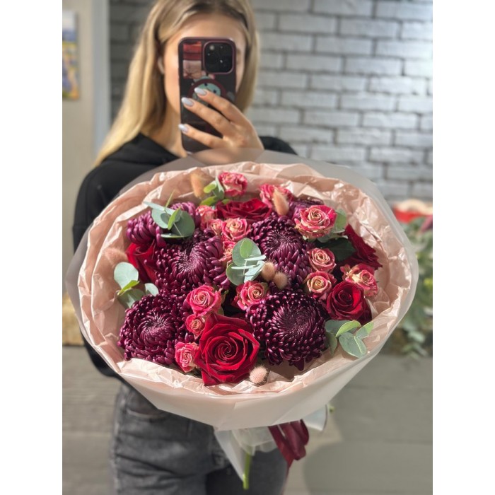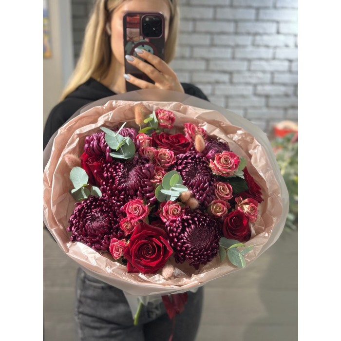 Стильный насыщенный букет из хризантемы, кустовой розы, одноголовой розы и эвкалипта, выполненный в упаковку.