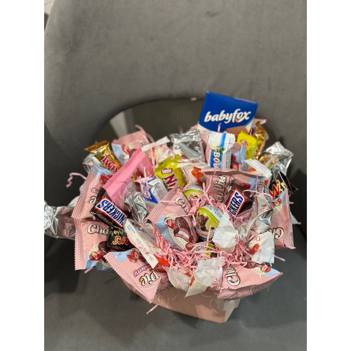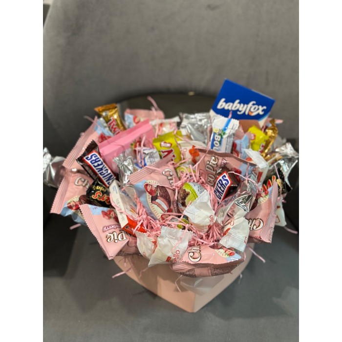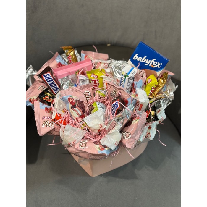 Сладкая композиция в коробке, выполненная из конфет, печенек, шоколадок. Красивая композиция, а главное вкусная.